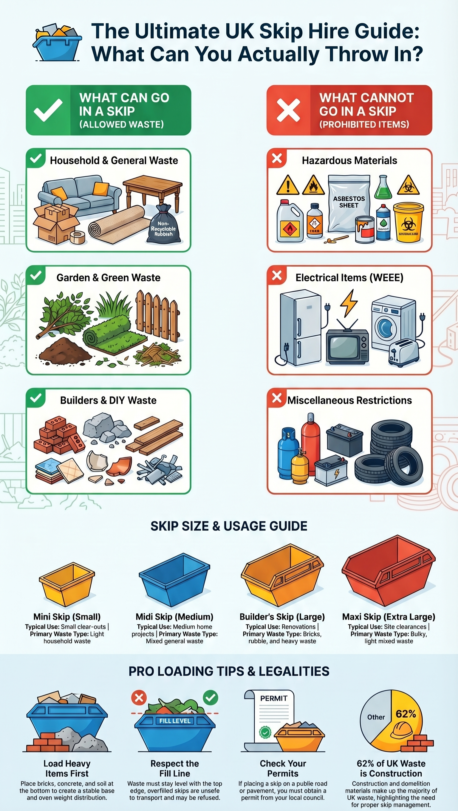 You can put most non-hazardous household, garden, and construction waste in a skip in the UK, including furniture, soil, rubble, and general waste, but certain restricted items must stay out.